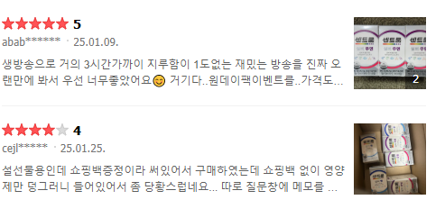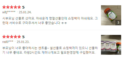 - wltj*** 님:** 시부모님 선물로 구매했으나, 명절 선물용 쇼핑백이 없어 아쉬웠습니다. 하지만 서비스로 구미를 받아서 좋았습니다.