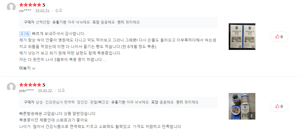 - lcw2****님: "빠른 배송 감사합니다. 계속 먹으니 위에 굉장히 좋아요."